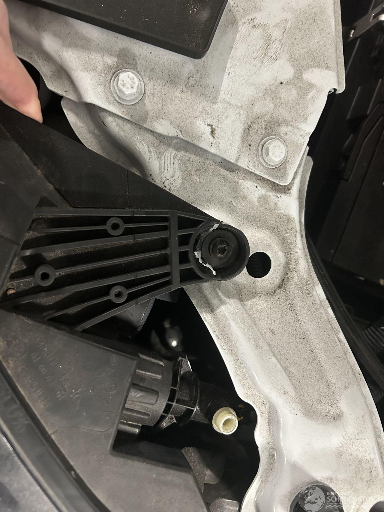 Van de koplampen zijn de bovenste steuntjes gescheurd.