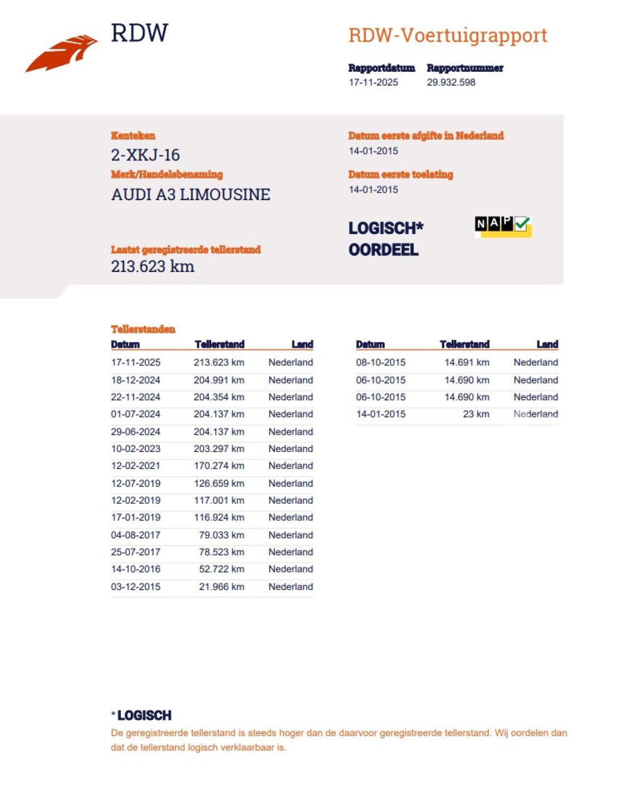 Indication du compteur: 213.624 KM